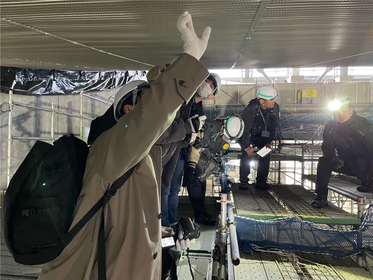 普段は入ることのない工事の仮囲の中。足場を歩きながら、建物の内部を見て回ります。