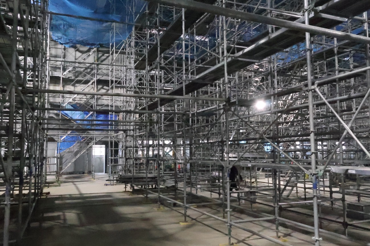 足場を登り、プールの天井へ