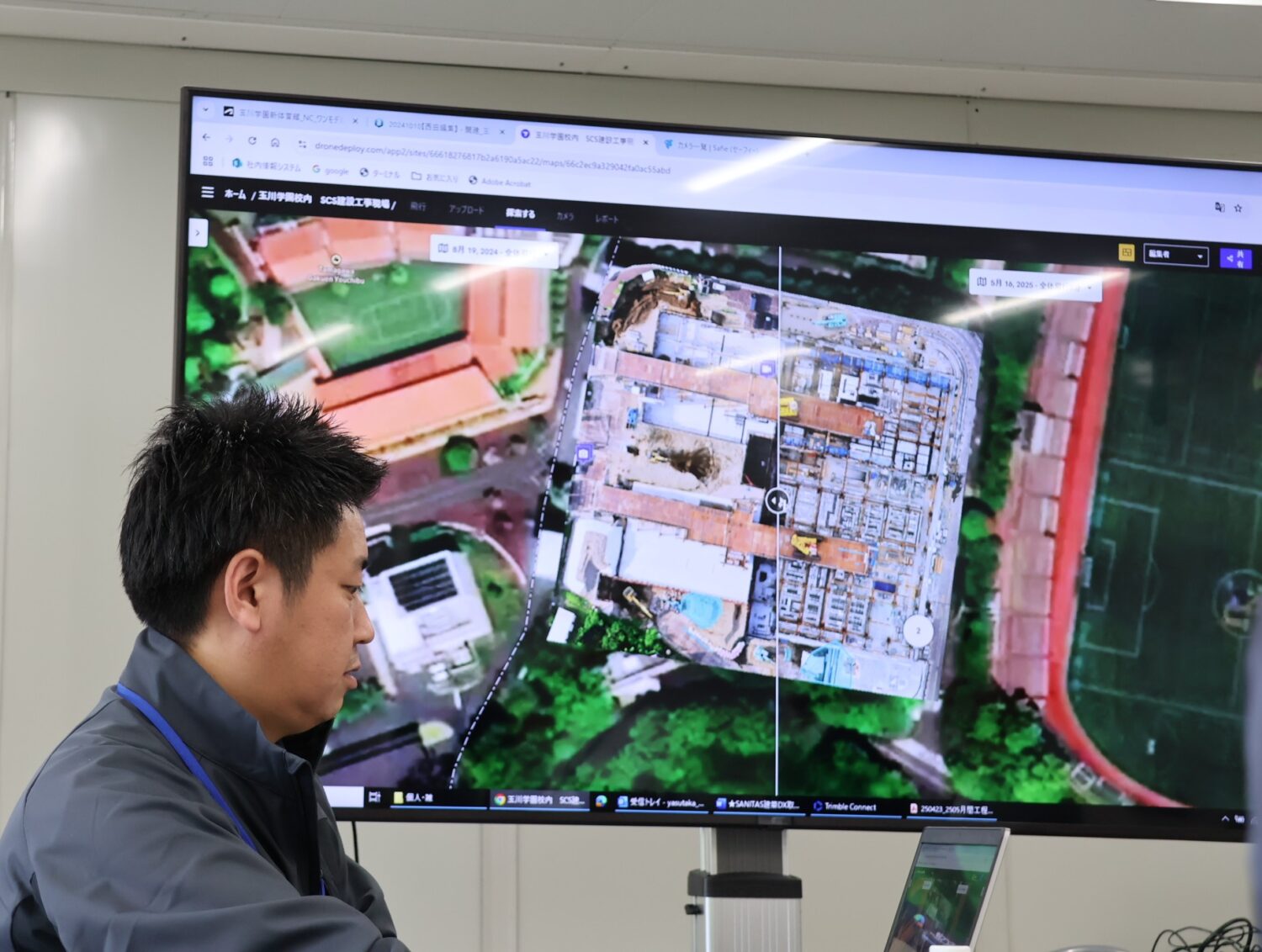 慢性的な人手不足や技能者の高齢化が深刻となり、時間外労働の上限規制も強化されたことから、近年、建設業における生産性向上が喫緊の課題となっています。SANITASの建設現場には、建築の最新技術である3次元(3D)モデリング技術「BIM(Building Information Modeling)」をはじめ、飛行ロボット(ドローン)や人工知能(AI)、拡張現実(AR)といったさまざまな最新テクノロジーが導入され、作業の効率化に寄与しています。こうした建築デジタルトランスフォーメーション(DX)の一端に触れてもらうため、玉川学園は西松建設と共同で、建設中の現場を学内関係者に案内し、そこで活用されている技術などを解説する生徒・学生向けの見学会を開催してきました。さらに、現場をライトアップし、タワークレーンを使って光の演出を行う「クローラークレーン・イルミネーション」も実施するなど、学びの機会をたびたび取り入れてきました。